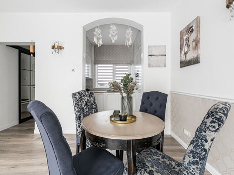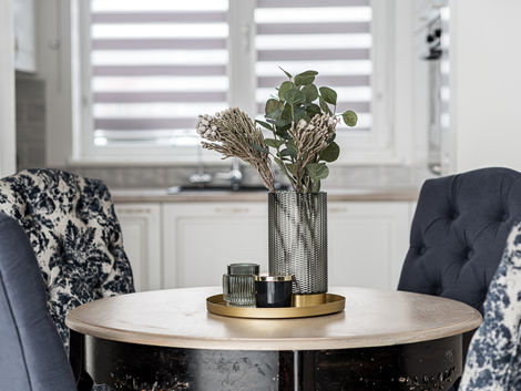 Kotedžas suprojektuotas taip, kad jame patogiai gyventų trijų asmenų šeima. Interjeras atitinka šeimininkų charakterį - turi matytis kuo mažiau daiktų. Viskas ko reikia aplinkai - tai interjero detalės, kurios atlieka savo funkciją ir puošia namus. Tvarkai palaikyti kotedže integruotas pakankamas kiekis spintų ir funkcionalaus išplanavimo idėjų.